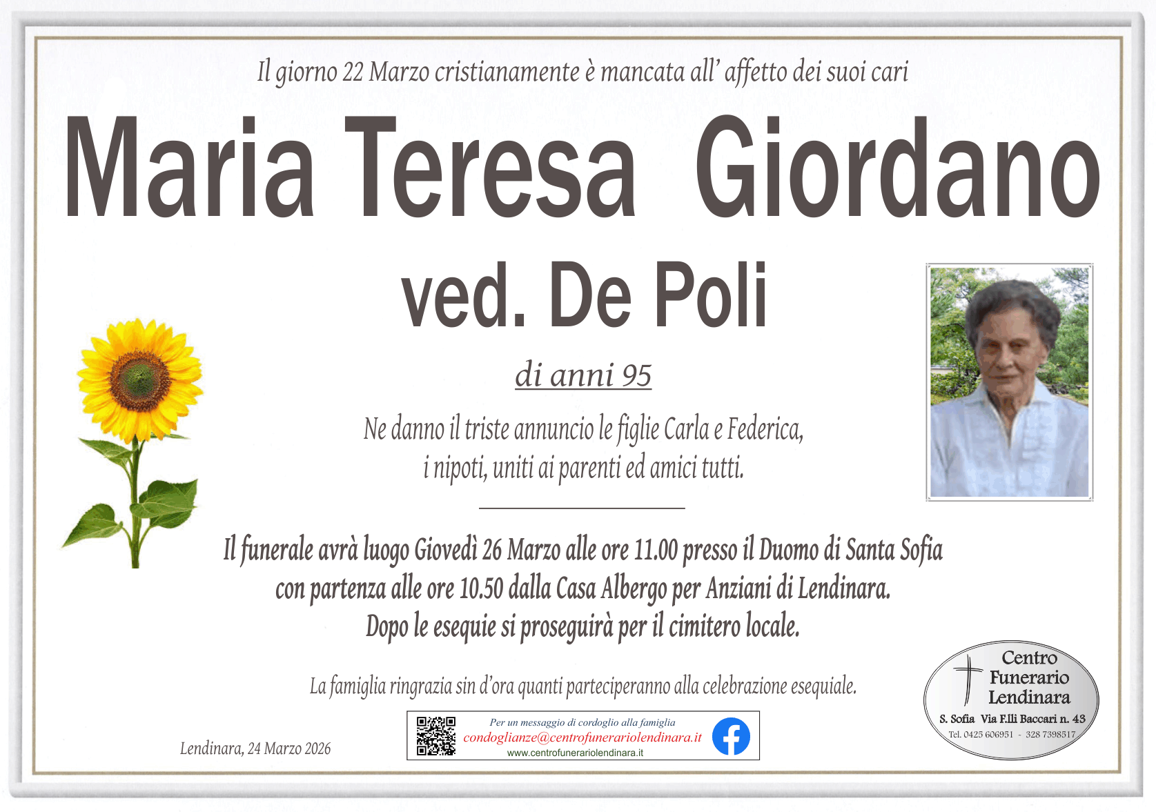 Puoi inviare un messaggio di cordoglio ai parenti da Qui